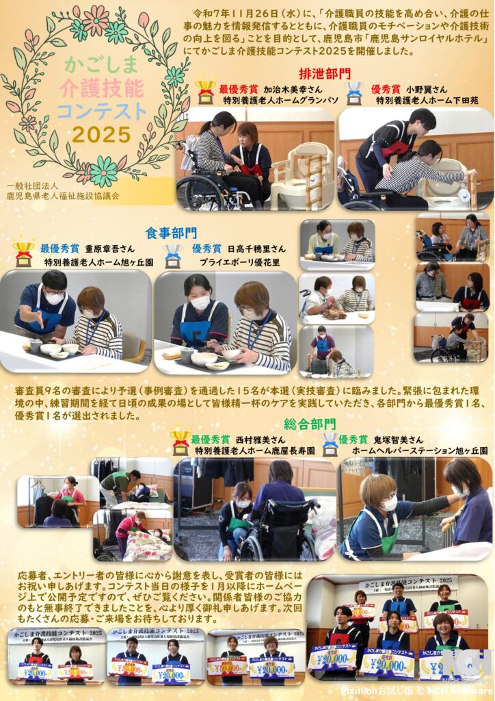 かごしま介護技能コンテスト2025(報告) 記事登校日: 2026年1月27日2026年1月27日 ↑ コンテスト当日の様子をご覧ください。 ↑ 全ての受賞者の実技審査シーンの動画もYou Tubeにアップしているので、是非ご覧ください。 (終了画面にリンクが貼ってあります。)